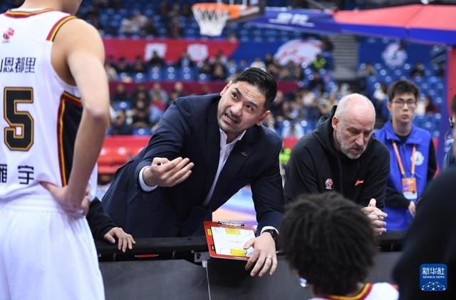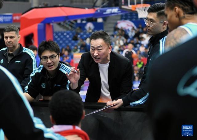 1月15日,青岛崂山啤酒队主教练刘维伟(中)在比赛中向队员布置战术。新华社记者 李紫恒 摄