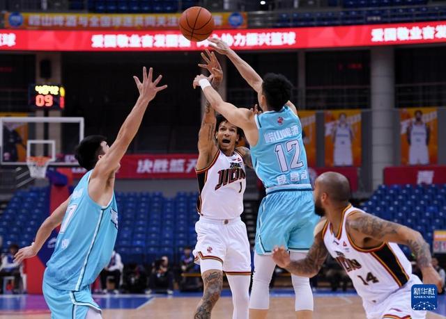 1月15日,青岛崂山啤酒队球员段昂君(左)在比赛中防守吉林长白山恩都里队球员摩尔。新华社记者 李紫恒 摄