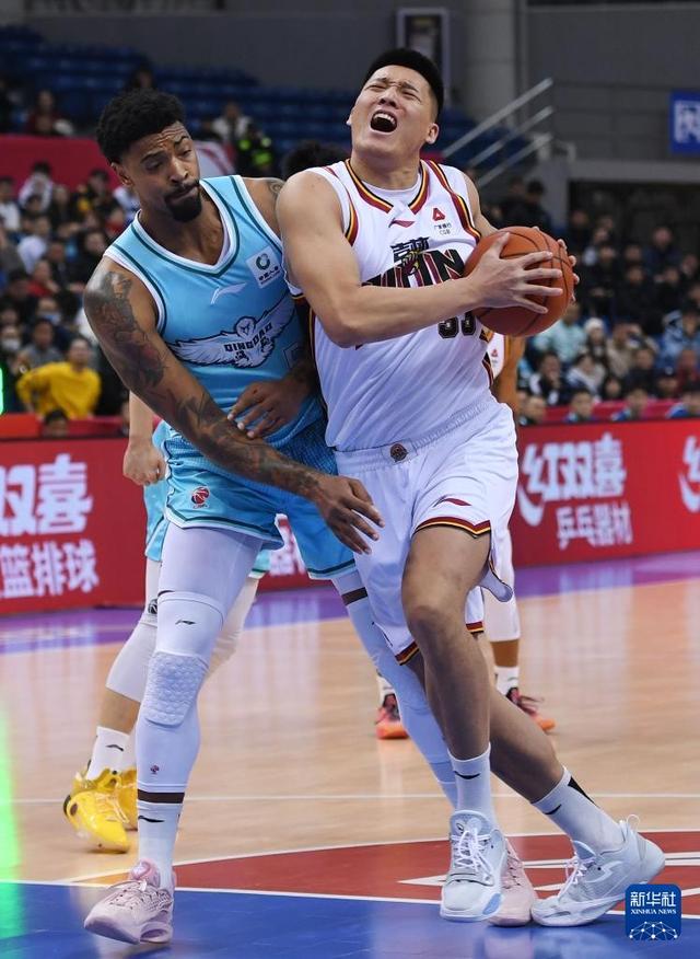 1月15日,青岛崂山啤酒队球员段昂君(左)在比赛中防守吉林长白山恩都里队球员摩尔。新华社记者 李紫恒 摄